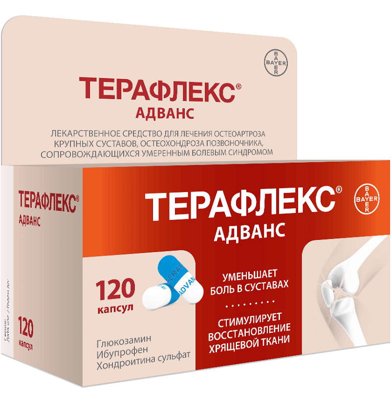 Терафлекс Адванс представляет собой комбинированный препарат, содержащий в качестве активных компонентов хондроитина сульфат, глюкозамина сульфат и ибупрофен.