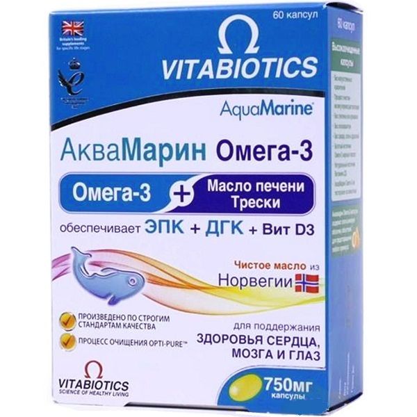 АкваМарин Омега-3 разработан английской компанией Витабиотикс. АкваМарин Омега-3 - это рыбий жир премиум класса, который удовлетворяет самым высоким стандартам качества и чистоты. Высокоочищенный рыбий жир, используемый в капсулах АкваМарин Омега-3, является богатым источником Омега-3 жирных кислот (Докозагексаеновой кислоты (ДГК) и Эйкозапентаеновой кислоты (ЭПК)). ЭПК и ДГК являются физиологически необходимыми жирными кислотами, поэтому они должны поступать вместе с пищей. Регулярное ежедневное потребление рыбьего жира в настоящее время рекомендуется различными научными организациями, включая Британский фонд питания. Кроме обеспечения Омега-3 жирными кислотами, АкваМарин Омега-3 содержит масло печени Трески, которое является натуральным источником витамина D3. В препарат также добавлен Витамин Е, являющийся ценным антиоксидантом.