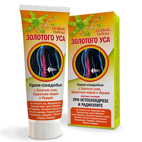 Новые тайны золотого уса крем-снадобье при боли в суставах и отложении солей рекомендован для снятия болевых ощущений в мышцах и суставах при отложении солей, нормализует подвижность суставов. Экстракты лекарственных растений, входящих в состав «Крема-снадобья» (экстракты золотого уса, сабельника, крапивы, конского каштана, зверобоя и др.) весьма богаты флавоноидами, витамином С и дубильными веществами.